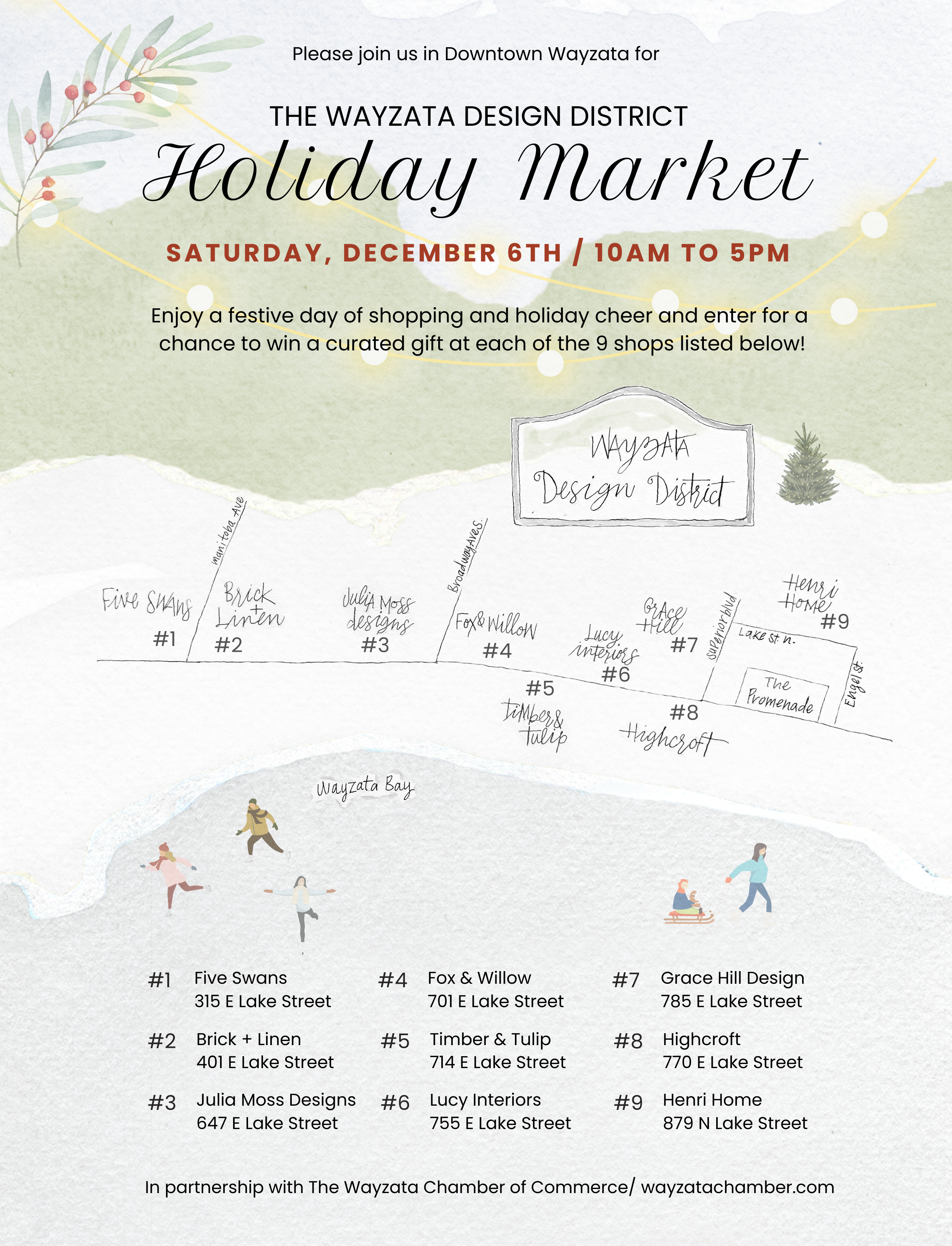 Saturday, December 6th – We will be hosting a winter open house event along with the other businesses in the Wayzata Design District. Join us for festive shopping, free gifts with purchase, enter to win a drawing, and in store specials, and live holiday music!